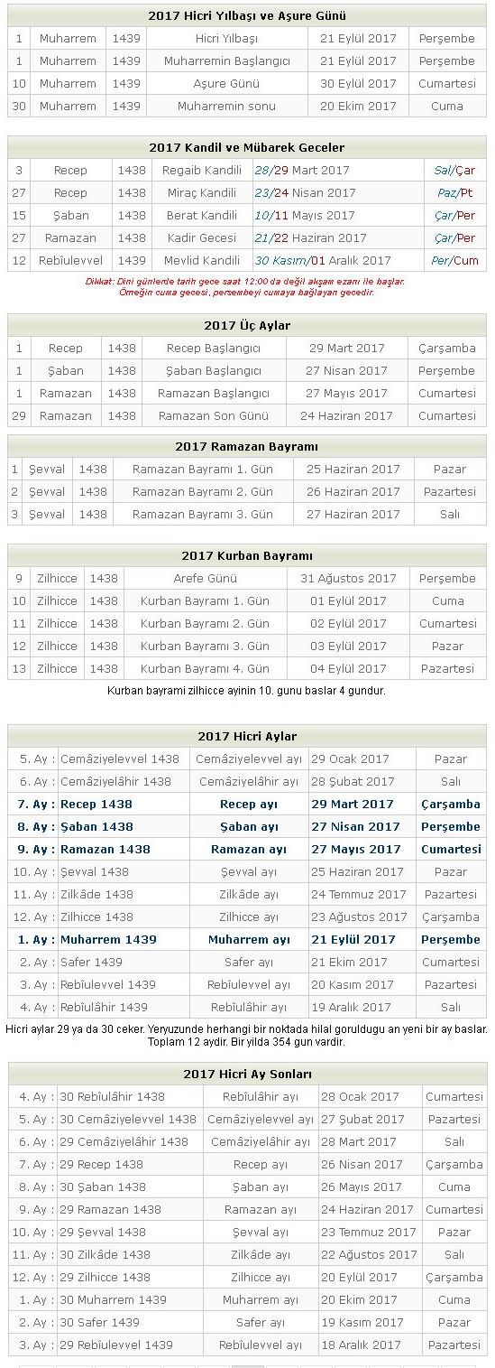 2017 YILI DİNİ GÜNLER LİSTESİ